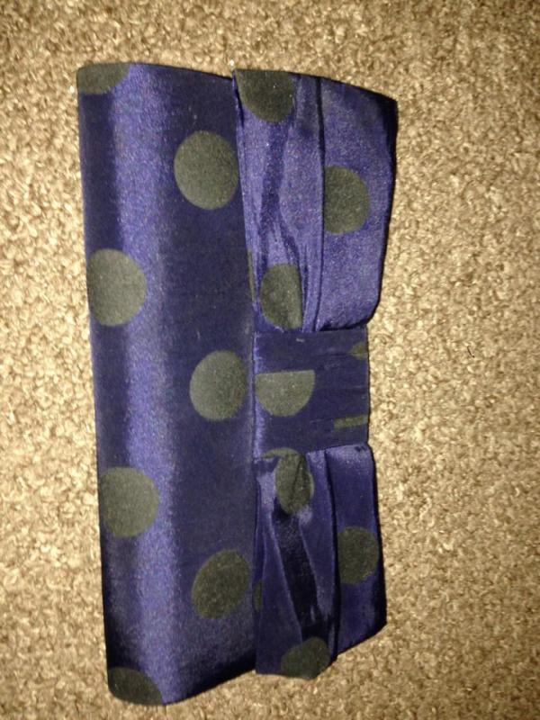 navy clutch with black polka dots and bow detail, used once so in perfect condition...
