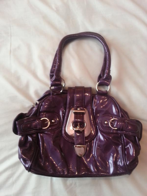 Purple bag, new with label, pouch pockets on either side, zip fastening, buckle design stud fastening overlap, selling f...