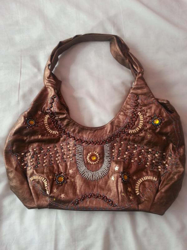 Golden brown bag, new with label, beaded pattern at front, 2 handles, soft material, zip fastening, selling for £10...