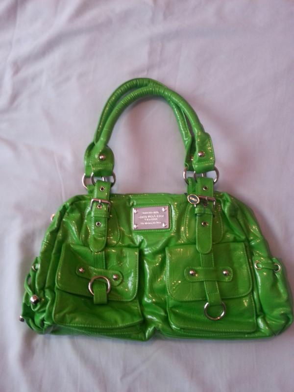 Green bag, new with label, 2 handles attached to bag by buckles, zip fastening, side pouch pockets, 2 stud fastening fro...