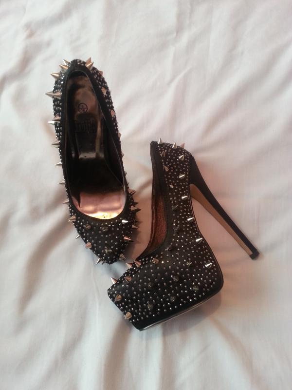 Black platform stiletto shoes with silver spikes and studs, worn once, size 3, selling for £22...