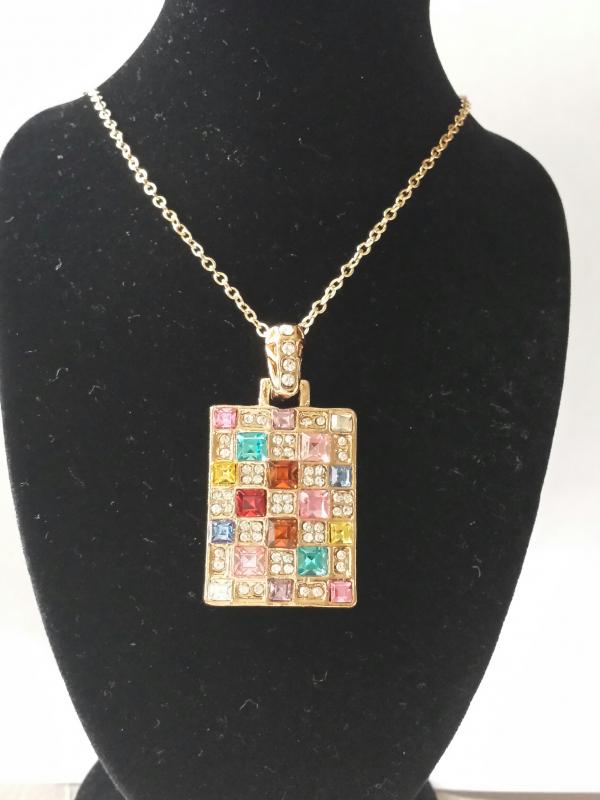 Silver coloured rectangle necklace with coloured stones. Chain length 17inch, comes in gift pouch, £8...